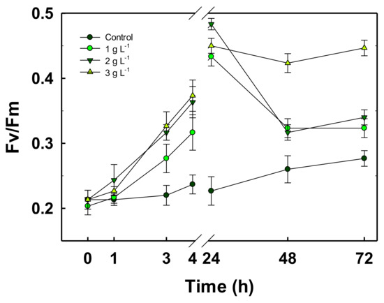 Maximum quantum yield (Fv/Fm) in Chlorella sorokiniana control cells and in bicarbonate 1 g L−1, 2 g L−1, and 3 g L−1 enriched cultures. Error bars represent SD (n = 3).