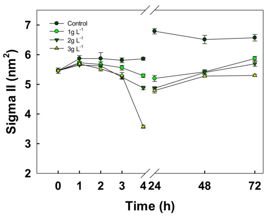The maximum quantum yield [Fv/Fm = (Fm − F0)/Fm] increased over 24 h for all treatments (Figure 5). In the first 4 h, Fv/Fm changed from 0.2 to 0.32 ± 0.027 in 1 g L−1, to 0.36 ± 0.024 in 2 g L−1 and to 0.37 ± 0.024 in 3 g L−1 supplemented, while the control slightly increased up to 0.24 ± 0.014 (Figure 5). After 24 h, algal cells supplemented with bicarbonate reached their maximum Fv/Fm values but later, while NaHCO3 3 g L−1 remained high until the end of the experiments, NaHCO3 1 g L−1 and 2 g L−1 both decreased to the values of about 0.32. Control cells, instead, showed lower Fv/Fm for the entire period, reaching a relative maximum of 0.28 ± 0.012 after 72 h. The maximum PSII effective absorption cross-section (σPSII) of the control cells differed significantly from bicarbonate treatments after 72 h (Figure 6). While in the first 2 h, σPSII of NaHCO3 1, 2, 3 g L−1 supplemented cells were similar to that observed in the control, after 4 h NaHCO3 2 and 3 g L−1 supplemented cells showed a sensible decrease to 4.88 ± 0.06 and 3.57 ± 0.05, respectively. After 24 h, bicarbonate treated cells displayed a visible and significant difference in σPSII compared to the control (6.57 ± 0.11).