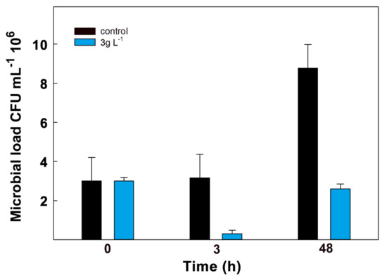 Microbial contamination reduction in Chlorella sorokiniana cultured with 0 or 3 g L−1 of sodium bicarbonate. Analysis performed three times, after 0, 3, and 48 h after bicarbonate addition.