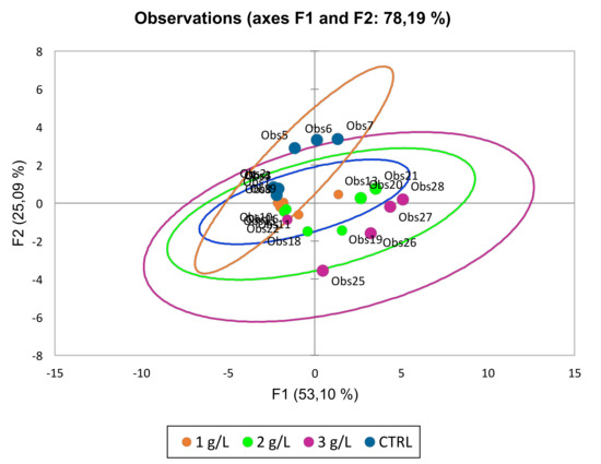 Principal component analysis (PCA): Distribution of treatments grouped according to different bicarbonate concentration. Control (orange color), 1 g L−1 (blue color), 2 g L−1 (green color), and 3 g L−1 (pink color).