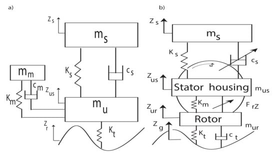 In the last years, some solutions in automotive suspension systems aimed to reduce vibration effects in in-wheel EVs have been reported. In Nagaya et al. [], the in-wheel electric motor is employed as an “Advanced-Dynamic-Damper-Motor” (ADM), where the electric motor is considered as a damper mass in order to decrease tire contact force fluctuation in the vehicle. This achievement was accomplished by attaching the motor in the unsprung mass by employing a spring and damper of exclusive use, Figure 1a). As a result, the vibration of the sprung mass decreased. In Ma et al. [], the ADM and an LQR active suspension systems are considered for sprung mass vibration reduction but also a vertical linear force () provided by the switched reluctance (SR) in-wheel electric motor is taken into account for the analysis of the vertical dynamics. In Wang et al. [], an FxLMS (filtered-X-least mean square) is proposed for improving suspension performance with an active suspension system. In this case, the electric motor is considered as part of the unsprung mass, and the is also considered as an extra force adding vibration to the unsprung mass. The FxLMS controller is able to generate a controllable force for suppressing the vibration generated by . In Shao [], the ADM complemented by an active suspension system is employed, where the suspended motor and suspension parameters are optimized based on genetic algorithms (GA) and are complemented by an LQR controller for the active suspension system. Something similar occurs in Shao et al. [], where the ADM is complemented by a fault-tolerant fuzzy taking into account actuator faults and control inputs restrictions. The dynamic force transmitted to the in-wheel motor is taken as an additional controlled output as a way for reducing motor wear. In Liu et al. [], a two-stage optimization control method is proposed to improve ADM performance. Where an LQR based on Particle Swarm Optimization (PSO) is designed for mitigating the in-wheel electric motor vibration and a finite-frequency controller is designed for the active suspension. Obtaining, as a result, a method which is able to improve the ride comfort and mitigates in-wheel motor vibration. Li et al. [] consider the stator (housing) of the in-wheel electric motor as the unsprung mass and the rotor as an extra mass in the in-wheel vehicle dynamic model, Figure 1b). In this work, a multi-objective optimization control method of active suspension for solving the negative vibration issues generated by is presented. The PSO method is employed for obtaining active suspension system optimal parameters. The results show that the optimized suspension system is able to reduce the effects of . In Zhu et al. [], the vibrations given by the switched reluctance motor (SRM) are analyzed, and some control strategies which consider the vertical acceleration of the chassis as a control objective are proposed as a way of mitigating them. At the end, a switchable controller based on the proposed strategies is given as a way for guaranteeing the best performance for each driving condition tested. As can be seen, the current work in suspension systems for in-wheel electric vehicles is focused on active suspension systems, which demands more energy consumption as well as instrumentation.