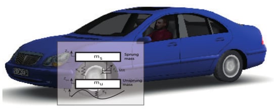 From control of semi-active suspension systems in ICE vehicles in the last years, it can be said that the Fuzzy [,,,,], Sky-Hook [,,], and Ground-Hook [,] control strategies, as well as, their variations have been the most employed techniques for satisfying the main semi-active suspensions control objectives. In these semi-active approaches, the most common control output has been the desired damping force that later is converted to current in order to manipulate the MR but in some cases, as in References [,], where the control output is already current. The most employed control inputs are the speeds of the sprung and unsprung mass as well as the real time displacements. For the controllers validation through simulation, it is common to employ Matlab/Simulink [,,], Carsim [,], Bikesim [], Trucksim. All these programs require the parameters of the vehicle’s suspension, and a road disturbance profile to generate results. Most of the reported results refer to time tests, where the road profile is a step or bump-like signals, and/or frequency evaluations with white noise or sinusoidal signals are representing the road profile. Moreover, Typically, the quantitative performance evaluation is performed with root mean square (RMS) values in the time domain as in Reference [], and power spectral density (PSD) in the frequency domain []. For qualitative assessments, the objective is to improve the performance achieved with a passive as much as possible.