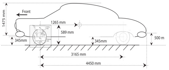 The main parameters of the QoV are the sprung mass (), which corresponds to the vehicle chassis (body) and components supported by the suspension, and the unsprung mass () is compounded by the wheel components (tire, rim, and links). From the sprung mass of the whole vehicle (), the () for the QoV must be estimated by making use of the weight distribution of the vehicle; which can be computed employing the dimensions shown in Figure 3. For the present case study, the sprung mass for the QoV is calculated as follows: . For that, it can be considered that the 60% of the body mass is located at the front part of the vehicle and 40% in the rear part.
