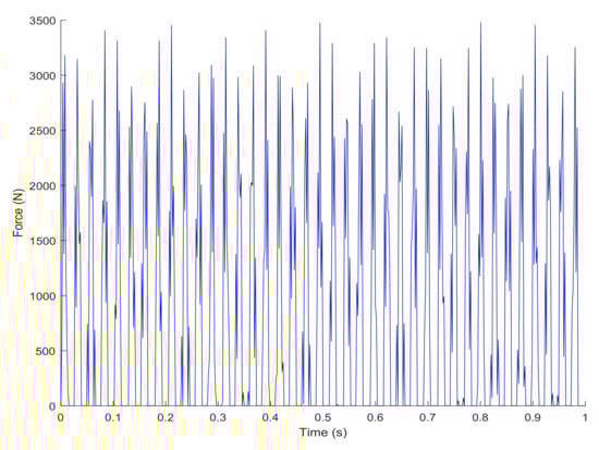 A modified F-class vehicle model is also studied, where an in-wheel electric motor is considered inside each wheel hub instead of a unique internal combustion motor. The parameters in Table 4 are estimated knowing the new mass values, battery bank, and the characteristics of the electric motors taken from Reference [] (for a general), and from Reference [] (characterized for a Brabus Electric 4WD Mercedes). The modified QoV parameters are shown in Table 5. The and resonance frequencies were estimated according to Reference []. For the in-wheel electric vehicle, a residual vertical force due to the electric motor can be considered for some tests. In this case, the residual vertical force that will be considered is shown in Figure 4 as in Reference []. Where it was estimated considering constant speed () and an SRM of 6 poles. The unbalanced vertical force is generated by the rotor eccentricity in the SRM and depends on the electromagnetic excitation. The unbalanced vertical force affects the vertical dynamics as an inertial force and occurs due to the gap shown in Figure 5. Which is given by the fabrication tolerances. As can be seen in Figure 5, has two components, the radial and tangential forces ( and ).
