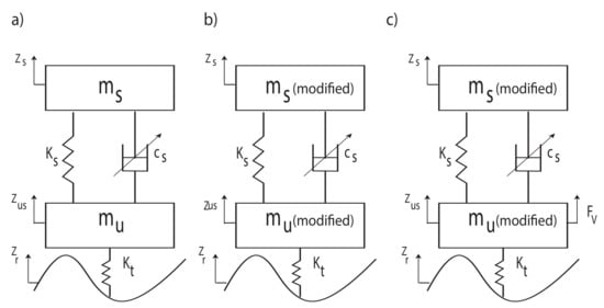 The normal QoV (NQoV) shown in Figure 6a corresponds to an ICE vehicle which has a semi-active suspension system and where a sprung and an unsprung mass are considered as in Reference []. The modified QoV (ModQoV) shown in Figure 6b corresponds to an in-wheel electric vehicle considering the electric motor as part of the unsprung mass and the battery bank as part of the sprung mass as it was described in Section 2.2. In Figure 6c (ModQoVFv) the same masses than in Figure 6b are considered as well as, the unbalanced vertical force () given by the in-wheel electric motor, as mentioned in Reference []. In this case, the active suspension system is replaced by a semi-active one. The mathematical model for the NQoV and ModQoV is given by the following equations: