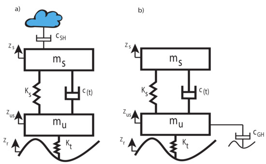 The control strategy known as GroungHook (GH) (Figure 7b) focuses on improving the road holding, and it is presented in Reference [], where a fictitious element (damper) between the ground and the wheel parallel to the tire is considered. This controller follows a similar principle to the SH but it is oriented to the dynamic tire-forces reduction to guarantee the desired level of road holding. The control law is given by: