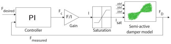 By making use of the Equation (17) and QoV parameters of Table 3 and Table 5 the ideal damping values for a corner (front side) of the vehicle are calculated in Table 6. For the and controllers, the output signal is force, and the damper model requires electric current as input for varying the MR damping force. For force to current equivalence, a feedback control as in Reference [] was implemented as it is shown in Figure 8. For tuning the FEB controller, four bandwidths must be determined according to Reference [], and employing the resonance frequencies of the masses shown in Table 3 and Table 5 for the normal and the modified QoV, respectively.