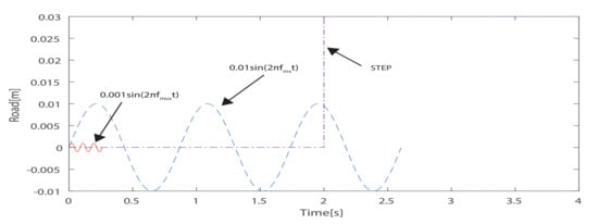- Sinusoidal road with resonance frequency. As a way to visualize the comfort and road holding conditions, whose are normally in 1–2 Hz and 10–15 Hz, a comparative work in the body and road holding resonance is performed employing sinusoidal roads. Two sinusoidal signals are considered with mm and mm, respectively, Figure 9. Considering the resonance frequency of the masses for each QoV setup.