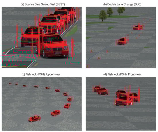 Three tests are considered for evaluating the full vehicle model in CarSim, Figure 11 []. The tests are—Bounce Sine Sweep Test (BSST), which is focused on ride comfort and human comfort; the Double Lane Change (DLC) test for handling, and the Fishhook (FSH) test, which is focused on handling and stability. In BSST, the variables of interest are the body vertical acceleration, body vertical displacement, and pitch angle. In the DLC and FSH tests, the variable of interest are—lateral acceleration, roll, yaw rate, vehicle sideslip angle, and roll rate. A description of each test follows: