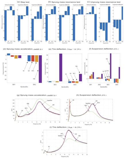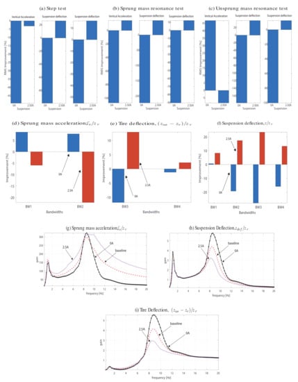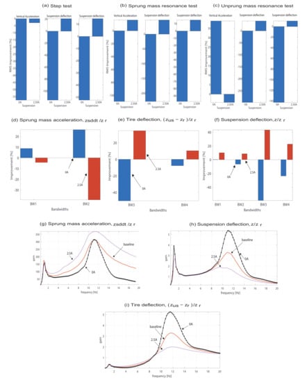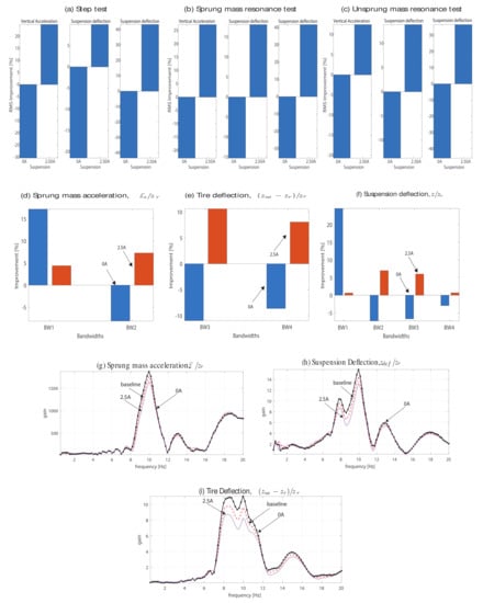 For comfort improvement in the NQoV, it is shown that for the step test (Figure 13a), the baseline suspension gives the best comfort improvement, followed by the . While in the sprung mass test (Figure 13b), the enhances comfort performance by , followed by the baseline suspension. In this case, the gives a negative comfort improvement. Besides, in the frequency domain the best improvement is given by the , which gives an improvement of the in accordance with the IPSD (Figure 13d) as well as the lowest gains in the pseudo-bode plot (Figure 13g), where it is also demonstrated that with lower current values (soft suspension), the performance is increased probably related to a high slope in the compression curve of the MR damper. According to this information, it can be said that the gives the best improvement in comfort for the NQoV in open loop. By the side of the road holding, it is improved in the step and unsprung mass tests (Figure 13a,c) by the in and , respectively. Which means that a harder suspension is required for improving the road holding. In the frequency domain, the improvement occurs in the same way, the current increases the road holding in the frequency domain by in accordance with the IPSD (Figure 13e) and gets the best gains in the pseudo-bode plot (Figure 13i) for the tire deflection in the interest bandwidths. That’s why the current level can be considered as the most effective for enhancing the road holding objective in open loop considering as reference a baseline suspension in the NQoV. By the side of the useful lifetime, it is enhanced by the of current in the step, sprung mass and unsprung mass tests (Figure 13a–c) by , and , respectively. Where it can be seen that the damper reduces the suspension deflection when the current level is increased (harder suspension). While with , the useful lifetime is decreased. Likewise, in the frequency domain wherein all the bandwidths, a hard suspension () optimizes the suspension deflection by in accordance with the IPSD (Figure 13f) and gives the lowest gains for the suspension deflection in the pseudo-bode plot (Figure 13h). According to the indexes discussed above, the best useful lifetime improvement is given by the of current for the NQoV in open loop considering as reference a baseline suspension.
