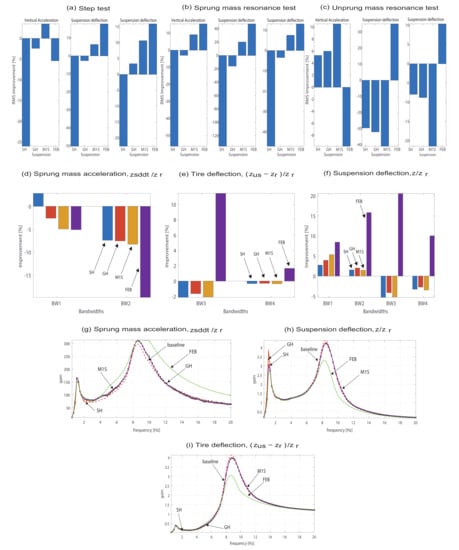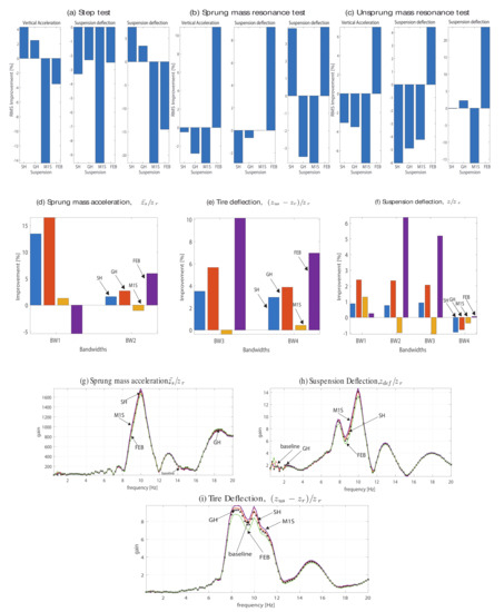 In the MQoVFV, comfort is improved in the step test (Figure 18a) by the SH controller in a followed by the GH controller, the rest of the controllers gives negative improvements. Besides, in the sprung mass test (Figure 18b), the comfort is enhanced by the FEB controller by . While the rest of controllers shows lower improvements than the baseline suspension. On the other hand, according to the IPSD (Figure 18a), the GH controller enhances the comfort by a followed by the FEB controller. While in the pseudo-bode plot (Figure 18a), the lower gains are given by the SH controller followed by the GH controller. According to the information described above, it can be said that the SH controller gives the highest comfort improvement for the MQoVFV in closed loop. By the side of the road holding, the SH controller enhances it by during the step test (Figure 18a) followed by the GH controller. The rest of the controllers show negative improvements. While in the unsprung mass (Figure 18c), the road holding is enhanced by the FEB controller by , also followed by the GH controller. In the frequency domain occurs almost the same, the FEB followed by the GH controller enhances the tire deflection by in accordance with the IPSD (Figure 18e) as well as gives the lowest gains in the pseudo-bode plot (Figure 18i). According to the information discussed above, the highest road holding improvement in the MQoVFV is given by the FEB controller in closed loop tests when compared against the baseline suspension. Finally, the useful lifetime is improved by the baseline in the step test (Figure 18a), followed by the GH and M1S controllers. While in the sprung mass and unsprung mass tests (Figure 18b,c), the FEB controller enhances the useful lifetime in a and , respectively. Where the rest of the controllers shows negative improvements. The same occurs in the frequency domain, where according to the IPSD (Figure 18f) and to the pseudo-bode plot (Figure 18h) gains, the FEB controller enhances the performance by . That’s why it can be stated that the FEB controller gives the higher useful lifetime improvement for the MQoVFV in closed loop, which means that suspension deflection has been decreased by the FEB controller.