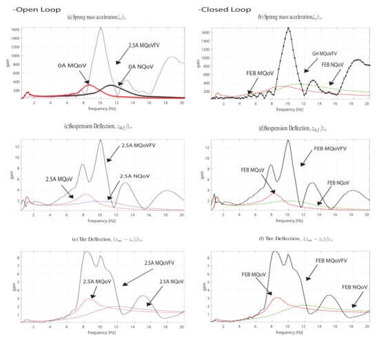 From the PSB’s best cases shown in Figure 19, it can be seen that in comparison with the other QoVs, the MQoVFV is showing higher gains in the resonance frequencies for all the interest variables. Among all the QoV’s exists resonance frequencies displacements, but in the displacement for the MQoVFV seems to be a little bit higher. For the sprung mass acceleration in open and closed loop, the best performance improvement is given by the in open loop for the NQoV and for the MQoV and by the FEB controller in closed loop. While for the MQoVFV, the best improvement is given by the and by the GH controller for open and closed loop, respectively. For the rest of the interest variables, the best performance improvement is given by the same current and control strategy in all the QoV’s.