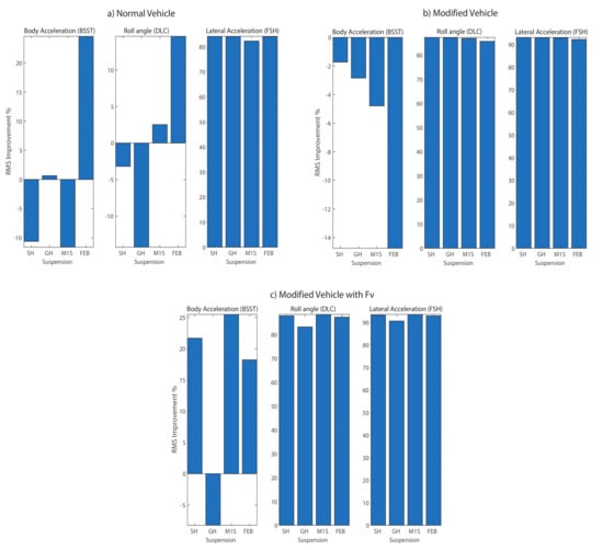The results for the full vehicle simulations are shown in Figure 20. The comfort improvement in the normal vehicle according to the body acceleration (Figure 20a) is given by the FEB controller followed by the GH. For the modified vehicle, the highest comfort improvement is given by the baseline suspension in accordance with the body acceleration (Figure 20b). When the unbalanced vertical force is taken into account, the highest comfort improvement is given by the M1S controller. Followed by the SH (Figure 20c). The highest roll improvement () in the normal vehicle is given by the FEB controller and followed by the M1S in accordance with the results shown in Figure (Figure 20a). For the modified vehicle, the highest roll improvement () is given by the SH controller, followed by the M1S and GH controllers. While when the unbalanced vertical force is taken into account, the M1S gives the best improvement (), followed by the SH controller. By the side of the road holding, the SH, GH, and FEB controllers are giving the biggest improvement in the lateral acceleration. However, the best improvement is giving by the GH controller (). In the modified vehicle, the GH controller is also giving the best performance () and is closely followed by the M1S and SH controllers. When considering the unbalanced vertical force, the highest road holding improvement () is given by the M1S. And as can be seen, the rest of the controllers is almost giving the same results.