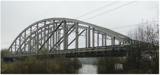 - Vičan, J.; Odrobiňák, J.; Gocál, J. Recently designed bow-string railway bridges in Slovakia. In Proceedings of the 7th International Conference on Arch Bridges (ARCH 2013), Split, Croatia, 2–4 October 2013; pp. 427–434. [Google Scholar]