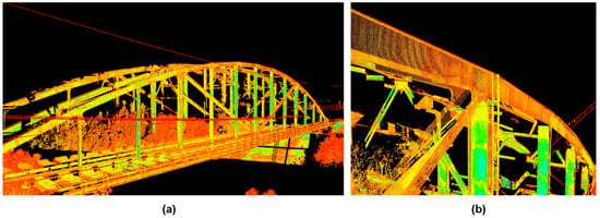 The Leica ScanStation C10 laser scanner was used to measure the geometrical shape of arches of the chosen bridge structure. The device has a guaranteed range of 300 m, a field of view of 360° × 270°, a scan speed of 50,000 pps and a scan density adjustable from 1 × 1 mm in the overall range. In the case of the presented measurement of the arch, the accuracy for the side edges of the arch cross-section of 2–3 mm could be obtained. Anyway, several complications occurred when scanning the arches. Worse reflective properties of the dirty coating led to more measurement stands. Another problem during the scanning was the poor accessibility of the measured bridge, because of the watercourse, untreated vegetation and terrain. It was also impossible to place the stands directly on the bridges, as all the measurements ran at full traffic operation. The scanning resulted into a group of mutually non-referenced scans, and the first task was to cross-reference each other. The resulting 3D model presented in Figure 3 did not need to be neither recalculated to absolute the coordinates nor georeferenced, so the resulting model was created in a relative coordinate system. Based on the recorded shape and position of the arch, the differences from the designed position can be derived.