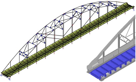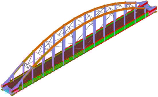 The first spatial numerical model was created in ADINA software (ver. 9.4.2, Adina R&D, Inc., Watertown, MA, USA, 2019). Almost all the parts of the bridge superstructure including the orthotropic deck were modelled within this model by shell finite elements (Figure 5). The beam elements were assumed only for upper bracings and for the diagonals between the hangers as well. The changes in thicknesses of each modelled 2D member were carefully taken into account in accordance with the bridge documentation and in situ verification. Special attention was paid to the approximation of the arch-to-girder connection, where all the relevant eccentricities, stiffeners and additional ribs were precisely considered.
