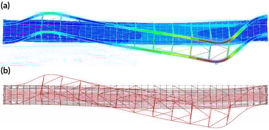 Shape of the first buckling mode of arches obtained by: (a) the ADINA “shell” model αcr = 6.0; and (b) the SCIA Engineer “beam” model αcr = 6.2.