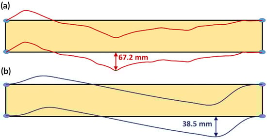 Simplistically, the value of the maximum horizontal displacement of the arch from its designed position was estimated as a sum of the global and local deviation from straightness. For the local deviation, the value of Lloc/750 was considered, but not less than 6 mm. Similarly, for the global tolerance, Lglob/500 was assumed, with a limit value of at least 12 mm. The first mode of out-of-plane stability reaches its maximum between the 11th and 12th hangers, therefore the local length Lloc = 8.96 m was taken, while for the “global” scale, the buckling length of the arch calculated by LSA was adopted, i.e., Lglob = 13.28 m. Thus, the amplitude of theoretical geometrical imperfection in the shape of the first out-of-plane buckling mode in this GNITGA analysis was the sum of the local and global tolerances 12.0 + 26.5 = 38.5 mm. The scheme of the axis of arches with theoretical geometrical imperfections are presented in Figure 8b