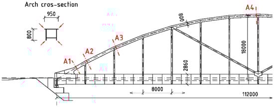 Side view of the bridge with the designation of the four selected arch cross-sections, where the stresses were analysed (dimensions in millimetres).