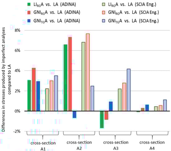 The graph in Figure 10 shows a percentage increase in stresses in the analyses with imperfections included in comparison with linear analyses without any imperfections (LA). Except for the differences between both software analyses, only a few percent of effect is evident. Surprisingly, the linear analyses with the real geometrical imperfections included (LIRGA) were very close to their more complex geometrically nonlinear alternative (GNIRGA).