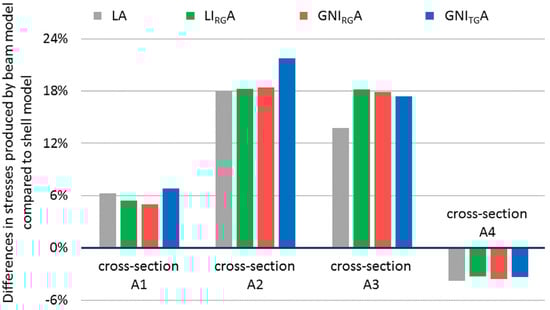 Percentage differences in the stresses produced by the common “beam” model in the SCIA Engineer compared to the more complex “shell” model in ADINA.
