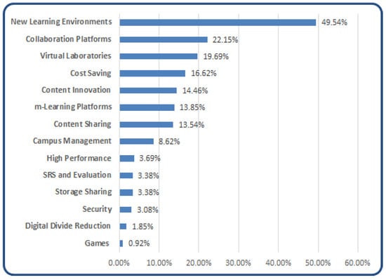 The areas that have attracted the most interest from the research community are those of the new learning environment, collaboration platforms, and virtual laboratories. However, since the same areas are less supported by empirical research than others, we believe that these should be more closely monitored by the scientific community. In absolute terms, the topics of security and digital divide reduction have been found to be less investigated, which consequently requires greater research by the scientific community.