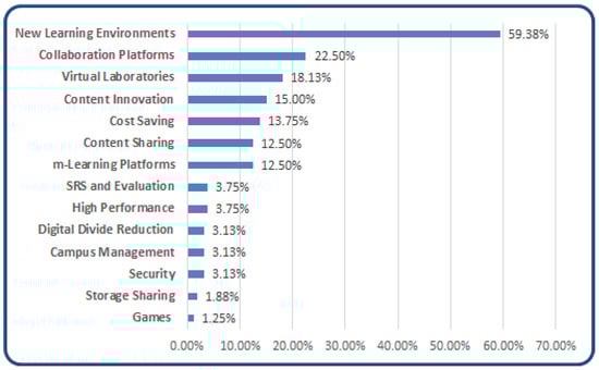 The aspects related to the adoption of cloud technology in higher educations or universities are also investigated in numerous studies, including for example [,,,,], in which opportunities provided by the use of the Cloud for these institutions are identified and highlighted.