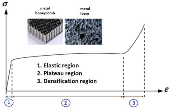 Metallic cellular structured materials are basically material with pores and have a density less than the material bulk density, depending on the porosity levels []. Examples of such materials are metallic foams or metallic honeycomb-like structures. Such cellular structured materials when they collapse under axial loading allow the structure to compress without significant transversal deformation. The influence of cell microstructure on the behavior is due to the fact that the deformation mechanism of the material at cell level is governed by bending and stretching of the cell wall followed by buckling at a post-yield stage []. This along with the plateau stress behavior (near constant deformation resistance) makes metallic cellular structures attractive for crashworthiness applications [,,,,,,,], as depicted in Figure 3.