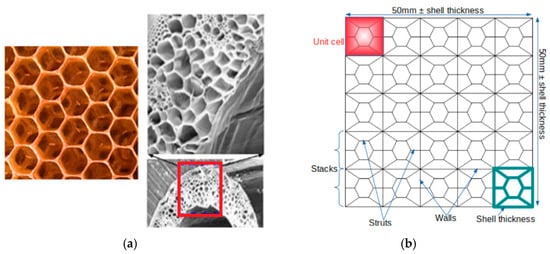 (a) Honeycomb design in nature, (b) nature-inspired cellular structure design for this study. The novelty is through the addition of walls and struts to the honeycomb design.