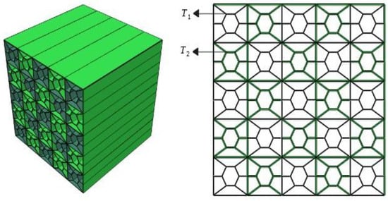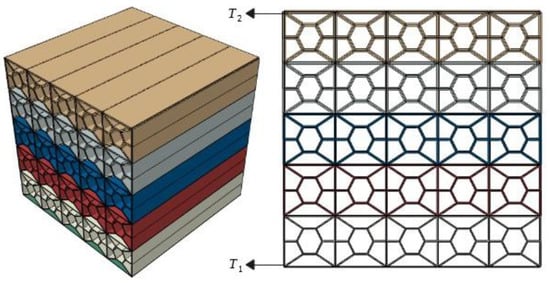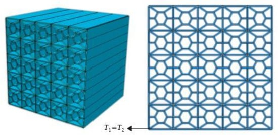Figure 4 shows the geometry of the cellular structure. The unit cell is a hexagon connected to a 10 × 10 mm square from its six corners. The sides of the square are considered walls whereas the hexagon and the lines extending from its corners are considered struts. The cellular structure is made from stacks of unit cells. The volume of the cellular structure is 50 × 50 × L mm. The length (L) is increased from 50 to 150 mm (increments of 50 mm) for studying the effects of length scaling. The struts, walls, and stacks are assigned thicknesses in four different ways as discussed below.