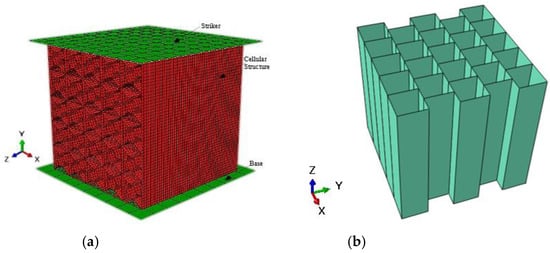 (a) The finite element model consists of a rigid striker that can translate along [-Y] with a specified velocity, a deformable cellular structure tied to a base, and a rigid base that is encastre (b) geometry used for validation purposes, maintaining the same model in (a).