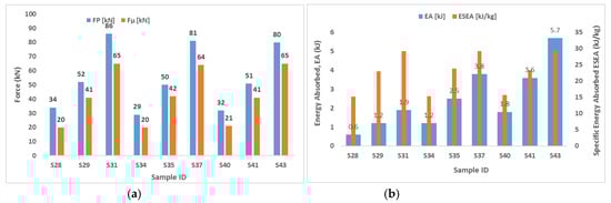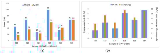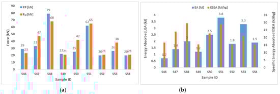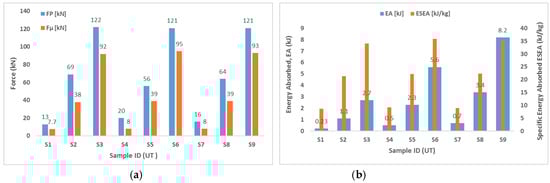 Based on ESEA, the cellular structures with the highest specific energy absorption from each group (UT, SWT, AT, GT) were selected. Sample S3 and its corresponding samples S6 and S9 with 100 and 150 mm, respectively had the highest ESEA among all specimen with 35 kJ/kg (S9), which is comparable to the results found by [,]. Sample S15 was the highest among the SWT type with 28.8 kJ/kg and its corresponding samples of 100 and 150 mm length are S21 and S27, respectively. The best ESEA for the AT type was sample S31 with 29 kJ/kg and the corresponding S37 and S48 of 100 and 150 mm, respectively. The best ESEA for the GT type was sample S48 with 29.6 kJ/kg and a gradient of 0.004. It is apparent that the UT configuration design will be the most suitable candidate as the crash energy absorber to replace existing designs in EV. The ESEA value obtained for the UT design (35 kJ/kg) is much higher than those reported for metallic aluminum forms (less than 10 kJ/kg) [], however comparatively close with aluminum honeycomb structures (less than 45 kJ/kg) [].
