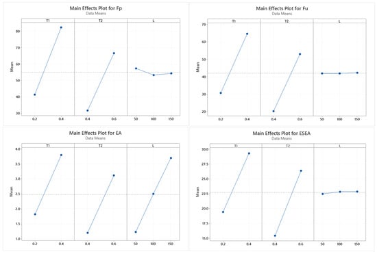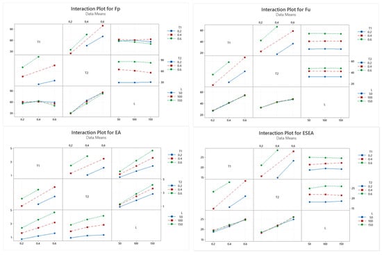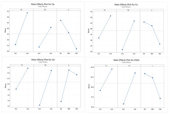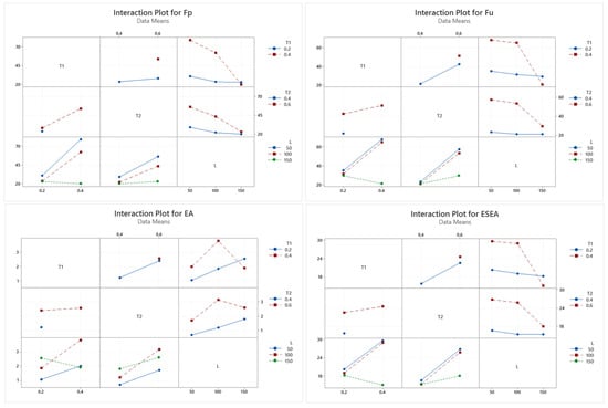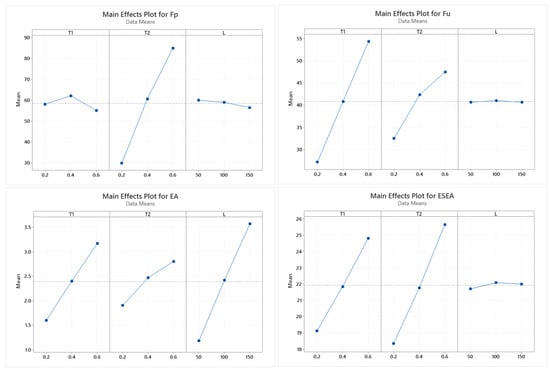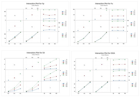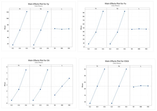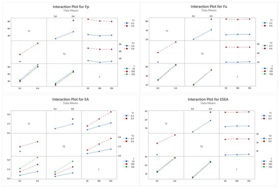To better understand the effect of design factors (thicknesses and length) on the responses (performance metrics) interaction plots are used. From Figure 11, it is evident that there are no interaction effects between these design factors. Meaning, these design factors are independent of each other. This is because on interaction plots, parallel lines indicate that there is no interaction effect while different slopes (positive versus negative slopes) suggest that one might be present. This finding allows us to safely interpret the mean plots for each response based on the design factors as shown in Figure 12. From Figure 12, it is evident that (i) the peak and mean forces increase as the thickness T1 and T2 increases. However, these forces are not affected by the length of the structure. The same applies to the specific energy absorption (ESEA) and (ii) the energy absorption (EA) is affected by all three factors, including length. This is obvious since there is more deformation distance before densification is reached. From these performance metrics, the mean force and ESEA are most crucial to be looked at. Hence, it can be concluded that the length of the structure is not a crucial factor to be considered. This will have an implication on the design space and manufacturing requirements. Figure 13 depicts a typical force-displacement graph along with the deformation mode for these structures. These diagrams are for T1 = T2 = 0.6 mm. It can be seen that the deformation mode is stable indicating good crash absorber characteristics. This figure also depicts that the average force and peak force is almost similar for all lengths, indicating once again that the length is not a crucial factor.