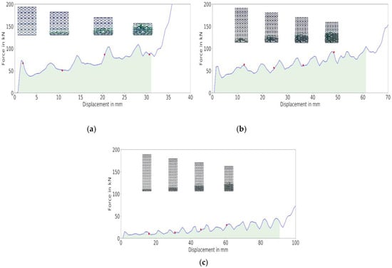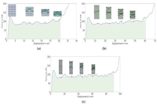 Example of force-displacement and deformation modes for (a) L = 50 mm, (b) L = 100 mm, (c) L = 150 mm. The shaded area indicates the energy absorbed before densification.