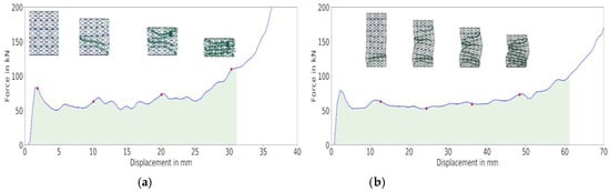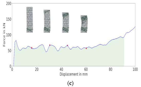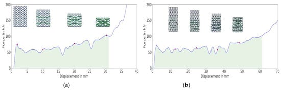 It should be noted here that in the simulations conducted in this study, the input kinetic energy was around 31 kJ as had been described in Section 3 of this paper. The maximum value of the energy absorbed by the best design reported (S9) is 8.2 kJ. Even though this is much lower than the input energy, what is important here is the specific energy absorption (ESEA). For sample S9, this value is 35 kJ/kg. Which means in order to be able to absorb 31 kJ of the input energy, ideally we will require around 0.9 kg of S9 [,]. In terms of densification, as seen in the force displacement diagrams depicted in Figure 13, Figure 16, Figure 21 and Figure 25 it is obvious that the design structures collapsed beyond the densification point, leading to a high value of forces which practically will not be safe for vehicle occupants. However, this is avoidable when a sufficient structural mass (crash element) is designed. For example, in the case of sample S9, ideally if 0.9 kg of structural mass (series configurations of several S9 design) is used, the deformation will not reach the point of densification as the input energy will be absorbed by the multiple S9 design arranged in a series configuration. Such studies as presented here are primarily investigating potential structural designs for crashworthiness application to reduce time and cost. Potential candidate designs will then have to undergo a full-scale vehicle crash test (simulation) with some optimization to achieve the desired design parameters to absorb the crash energy [].