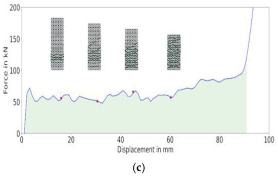 From Table 9 and Figure 22, Figure 23 and Figure 24, it is evident that the gradient has an insignificant impact on the performance metrics. The main contributor to the performance metrics is the thickness and length. Unlike the previous three designs, the length of the structure significantly affects gradient design. Figure 25 depicts the force-displacement diagram. It shows that the deformation modes are in a progressive and stable manner.