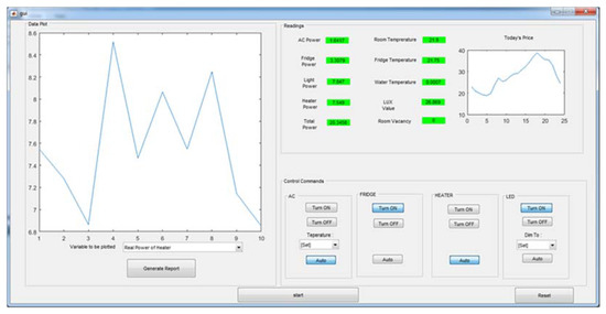 The configured XBee microcontroller is connected to a personal computer (PC) via a USB port and functions as a scheduling coordinator. A MATLAB program that is supported by a graphical user interface (GUI) on the main PC enables the user to input the desired comfort levels in terms of the room temperature, fridge temperature, water heater temperature, and illuminance ranges for the minimum, maximum, and normal pricing hours, respectively. The main scheduler also fetches the day-ahead pricing from the website of the utility service that are specified by the user. The day-ahead pricing trends used in the present study were obtained from [24]. The control commands are generated based on information predefined by the user, together with the power consumption information obtained from the smart sockets that are attached to the appliances, the heater outlet water temperature, and the room condition and occupancy information. The commands are in the form of binary decisions sent to specific smart plugs to turn on/off the connected appliances; dimming commands sent to Zigbee-connected dimmers to reduce/increase the light intensity of dimmable LEDs; and, temperature settings sent to Zigbee-connected infra-red (IR) remote controls to set ACs to specific temperatures. Figure 2 shows a screenshot of the scheduling coordinator’s GUI.