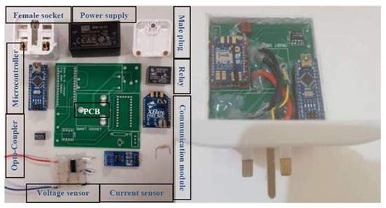 The smart plug/socket is able to monitor the power consumption of a connected appliance with a rating of up to 13 A, and turn it on/off using an integrated relay. The plug/socket determines and processes the single-phase power line voltage and current of the connected device, and then sends the captured data to a connected master node (when used) or the controller. The plug/socket uses the aforementioned wireless communication module and stores raw data provided by the microcontroller. Figure 3 shows the components (left) that were used to develop the plug/socket prototype (right).