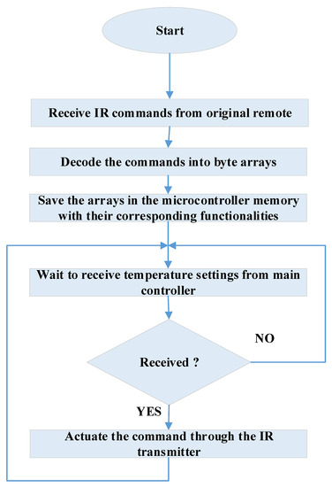 The remote control is capable of learning the IR digital code patterns transmitted by the original AC remote control while using a TSOP decoding diode and an Arduino Mega microcontroller. The microcontroller saves the patterns as digital commands, together with various temperature settings in its internal memory. The microcontroller transmits one of the earlier-learned IR codes through the IR transmitter when a remote command is received from the scheduling controller terminal via the integrated Zigbee communication module. Thus, the Zigbee connectivity of the remote control allows for the user to control the AC units through remote commands from the scheduler algorithm, or by manual commands via the user interface. The advantage of using this Zigbee based IR report is that the controlling the high power AC units do not require contactors with high current rating, as used in [17]. The proposed circuit can be duplicated to control multiple AC units. Figure 5 illustrates the operation of the remote control.