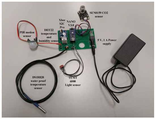 The proposed HEM system includes a circuit for monitoring and transmitting data on the ambient conditions, such as the room temperature, humidity, illuminance, and CO2 concentration. The circuit is also capable of detecting motion in the room through a motion sensor and is thus able to provide the main controller with the inputs required by the decision-making algorithm. Figure 7 shows the circuit and employed sensors.