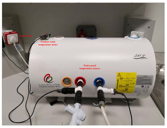 Figure 8 shows the setup for monitoring the water heater power consumption and temperatures. The heater was attached to a smart socket and two waterproof temperature sensors were plugged into the inlet and outlet water pipes of the heater.