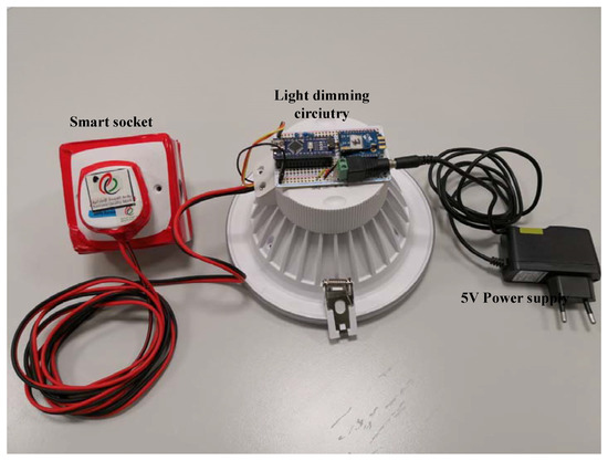 Similar to the case of the AC, power monitoring was the only function of the smart socket to which the LED light was connected. This was because the control task was assigned to the above-mentioned light dimming circuit. Figure 11 shows the connections for the LED light energy management. The control function of the dimming circuit was based on pulse width modulation (PWM). In the case of multiple LED light control, individual Zigbee based PWM control or single PWM generator with multiple dimmable LED driver circuits could be developed.
