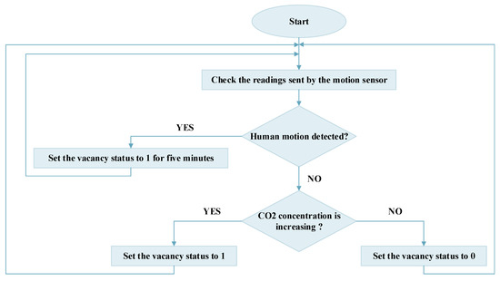 An increase in CO2 inside the room is detected by a decrease in the voltage reading of the sensor. In the present study, the CO2 sensor was placed in the experimental room and its readings were monitored during different known occupancy statuses of the room to set an appropriate voltage threshold. A reading above the threshold indicated vacancy, and vice versa. The flowchart presented in Figure 12 describes the vacancy identification process. Figure 13 shows the CO2 sensor readings during different occupancy statuses of the room over a 24-h period. When the CO2 concentration in the room settles at a certain level, it is always below the set threshold, whereas the occupancy of the room always takes it above the threshold.
