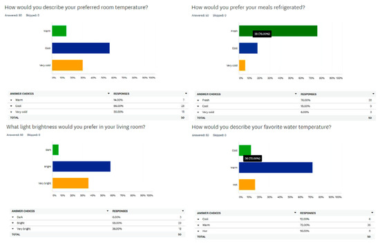 Based on the results of the survey in the previous section, Table 2 was developed to set the thresholds for the rules of the algorithm, after defining the terms in the answers and relating them with temperature and lux values [27,28]. A particular answer was chosen by the majority of the participants for each question, as can be observed from Table 2.