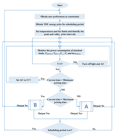 As an example of the use of the rules in the above equations, the algorithm dims the light to 50% when the room is vacant, with illuminance remaining within the comfort range during the maximum pricing hours to ensure that the energy consumption is reduced without affecting user comfort. Additionally, the AC is allowed to cool the room to the lowest allowed temperature during the minimum pricing time, and to increase the compressor off period outside the minimum pricing time. In another example regarding the use of the refrigerator equation, the refrigerator is turned off when the set minimum temperature is reached, regardless of the pricing signal. Further, the heater is turned on when the present water temperature is less than the set minimum. Equation (2) expresses other lighting levels for various conditions, while Equations (3)–(5) express other scheduling rules for the other appliances. Figure 15 shows a comprehensive flowchart of the energy management algorithm.