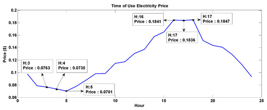 The duration of a day during the experiments comprised three main types of hours, namely, the minimum pricing hours (third, fourth, and fifth hours of the day), the maximum pricing hours (16th, 17th, and 18th hours), and the normal pricing hours (all other hours), as can be seen from Figure 16. The HEM algorithm was expected to manage the appliances in different ways during these three types of hours of the day.