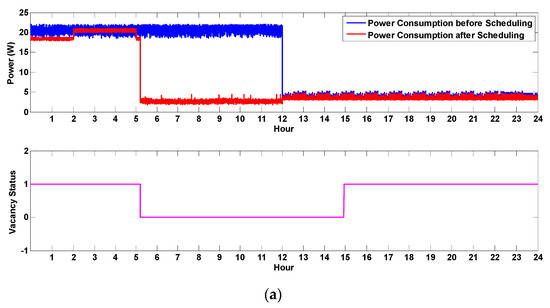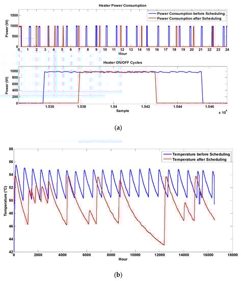 Similar to the case of the refrigerator, the operation of the water heater is not dependent on the occupancy status of the room. However, greater scheduling flexibility was possible with the water heater, because it could better preserve its internal temperature as compared with the refrigerator when considering that a water heater tank is not frequently opened. Figure 23 shows the power consumptions and temperature variations of the heated water without and with the use of the HEM system.