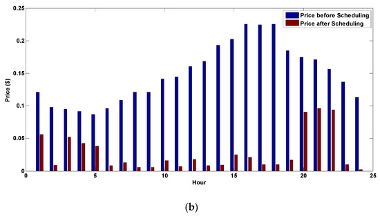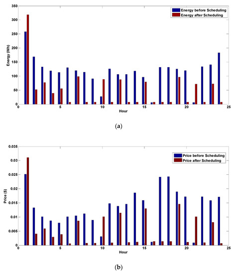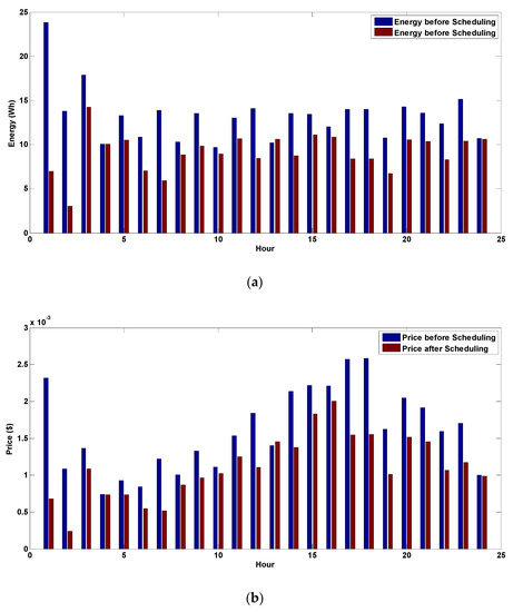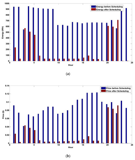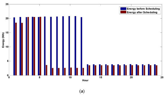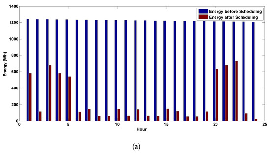The application of the proposed HEM system alters the previous constant total energy consumption over the day, with the previous maximum consumption only retained during the minimum pricing hours, as can be observed from Figure 26. The proposed system enabled total daily energy and bill savings of 23.5 kWh and $2.898, respectively.