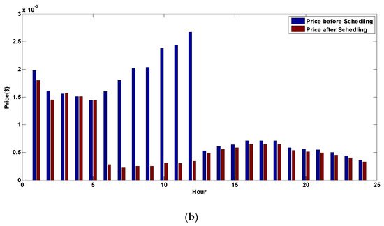The power consumption of the refrigerator was reduced by decreasing the time during which the refrigerator was switched on. The refrigerator was turned off during normal pricing hours when the lower preset temperature limit was reached, and more often during the maximum pricing time when the internal temperature was within the preset range. This can be clearly observed from the second graph of Figure 20b, where the on cycle while using the HEM system is narrower than that when not using the system during the maximum pricing hours. However, the HEM algorithm effectively managed the internal temperature within the desired range, regardless of the reduced power consumption and on time of the refrigerator. The benefit of the HEM algorithm can be assessed by comparison of the hourly energy consumptions and bills without and with the use of the proposed system, as illustrated in Figure 22.
