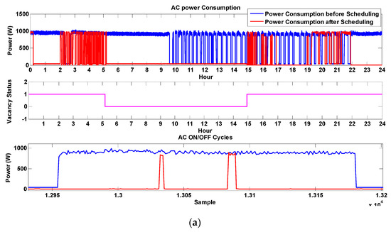During non-peak pricing hours, the AC was allowed to operate, provided that the room was occupied and the room temperature was within the preset limits. In addition, the algorithm controlled the AC to maintain the lowest possible temperature during low pricing hours, so it could be turned off during high pricing hours without affecting the user comfort. However, the AC was allowed to maintain the room temperature at the preset upper temperature during the maximum pricing hours, as can be observed from the third graph of Figure 18a. It was turned off more frequently when the room temperature was further below the preset maximum temperature. This can be observed from the noticeably different cycles of the AC compressor during the maximum pricing hours. Despite all of the applied constraints, the HEM algorithm was able to maintain the room temperature within the preset temperature range.